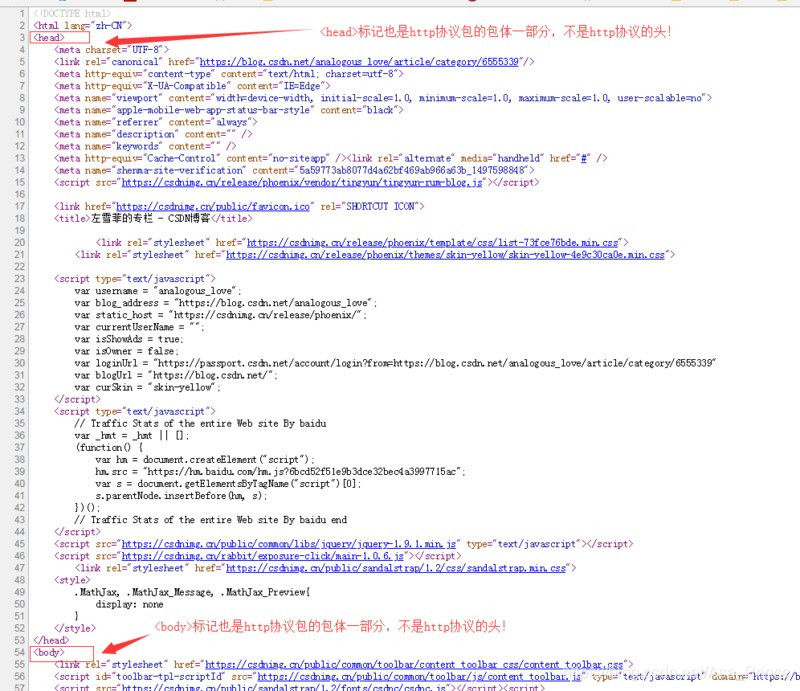 http协议也分为head和body两部分,但是我们一般说的html中的<head>和<body>标记不是http协议的头和身体,它们都是http协议的body部分。