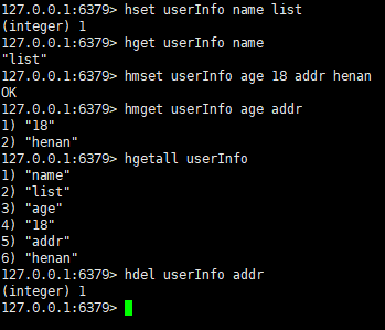 hmget userInfo age addr # 获取多个数据