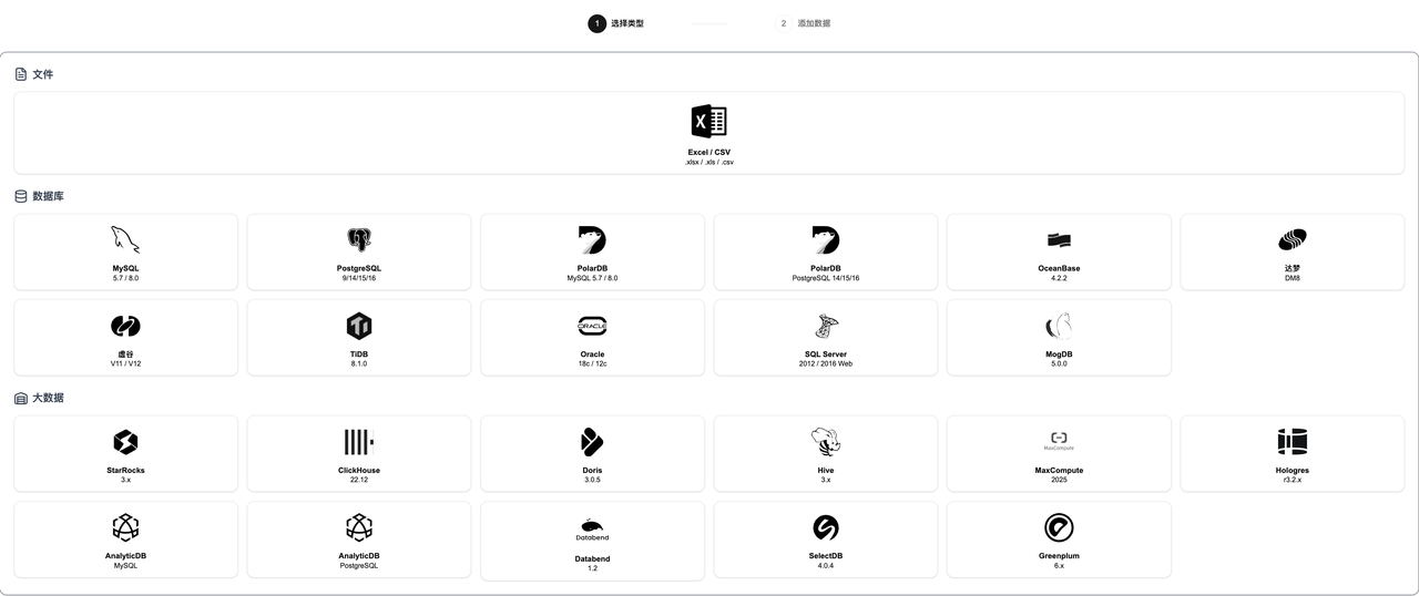 选择数据类型:在弹出的对话框中,选择您要添加的数据类型,包括 MySQL、PostgreSQL、TiDB、OceanBase、Excel 文件和 CSV 文件等。