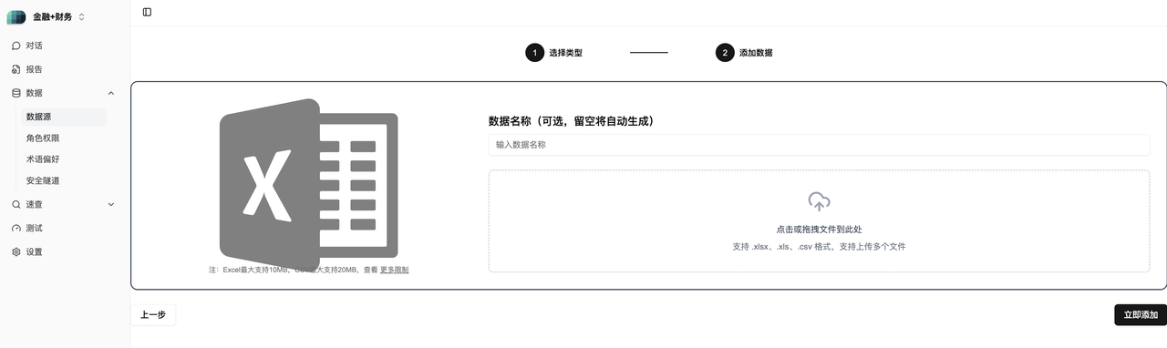 文件类型: 上传 Excel 或 CSV 文件。(支持跨文件、跨工作表联表查询)