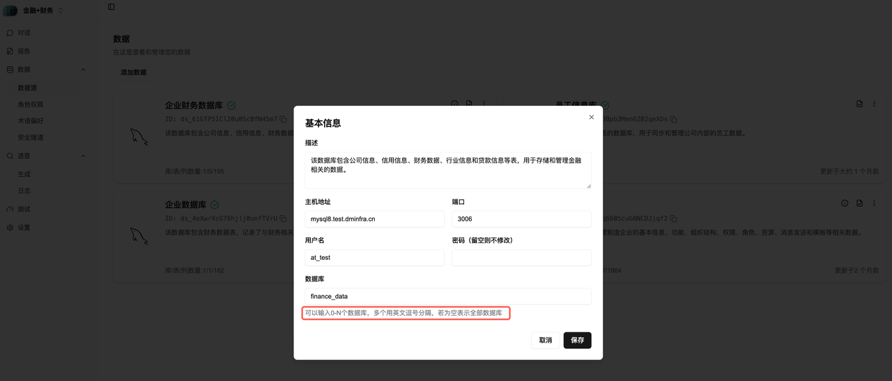 点击数据库数据源的“基本信息”->“编辑”按钮可以选择新增/删除同一实例下的数据库。