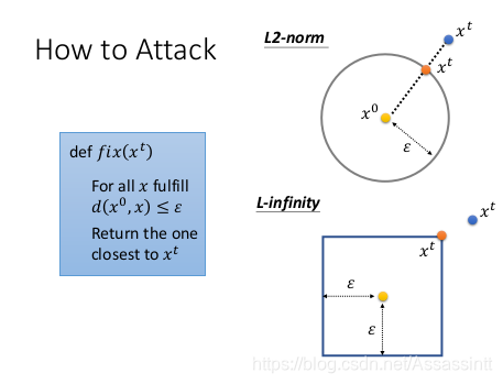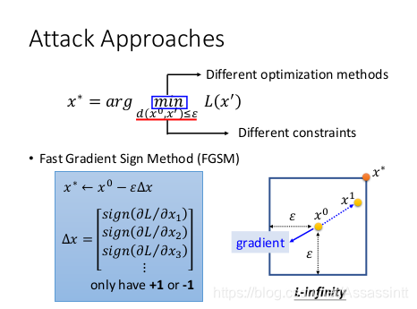 FGSM, 不关心距离, 只关系方向, 直接1, -1。一步到位, 类似, 设置了很大的learning rate, 最后落在distance上。 |
