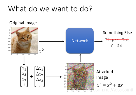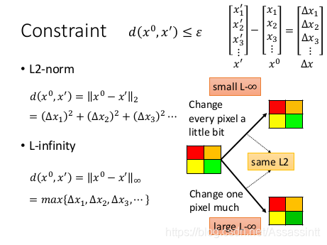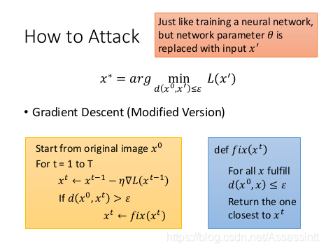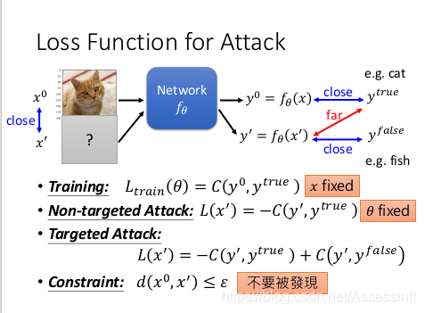 1.正常的training,Loss越小越好,使y接近正确结果。 2.无目标的攻击, 使loss越大越好。 -C 3. 有目标的攻击, 是 -C越大, 还要使目标越接近y的错值。 4. x' 和x0 距离d 小于等于一个值, 自定义。 |
