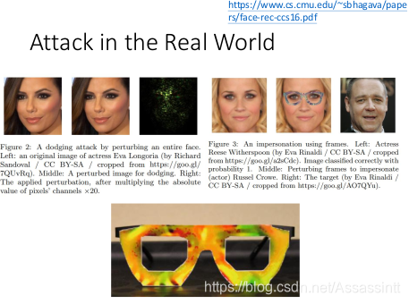 现实中攻击的例子 带上眼镜, 可以被人脸识别识别成某个明星