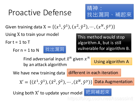 先用某种攻击算法, 把每个训练图片, 计算出攻击数据, 把攻击数据加入到training data,给他正确的label。 重新训练把洞补起来。因为新的参数可能产生新的漏洞, 所以继续重新训练,需要多次循环。