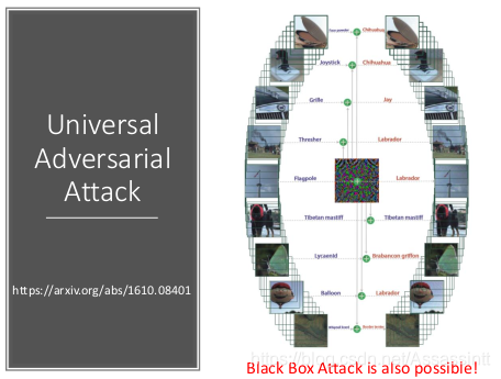 | Attack Approaches •常见攻击方法 FGSM (https://arxiv.org/abs/1412.6572) Basic iterative method (https://arxiv.org/abs/1607.02533) L-BFGS (https://arxiv.org/abs/1312.6199) Deepfool (https://arxiv.org/abs/1511.04599) JSMA (https://arxiv.org/abs/1511.07528) C&W (https://arxiv.org/abs/1608.04644) Elastic net attack (https://arxiv.org/abs/1709.04114) Spatially Transformed (https://arxiv.org/abs/1801.02612) One Pixel Attack (https://arxiv.org/abs/1710.08864) ...... only list a few |