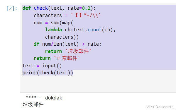 计算特定字符出现的总数与文本长度的比例,如果超过给定的 rate,则返回 '垃圾邮件',否则返回 '正常邮件'。