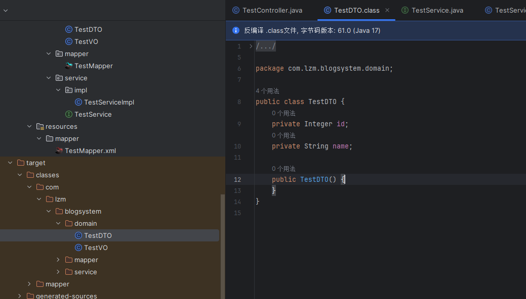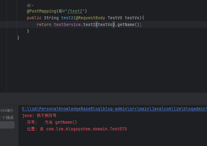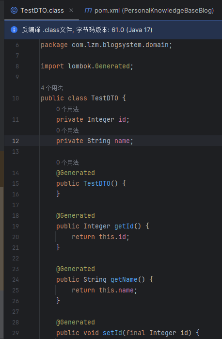 我们发现TestDTO里面没有发现get方法,怎么会!我明明用了lombok的@Data方法,讲道理应该自动生成get、set方法,然后又是各种查找解决方案,什么lombok插件不适配,lombok版本和idea版本不适配,巴拉巴拉都没有用,最后的最后我发现在我们的编译文件下并没有生成get、set方法