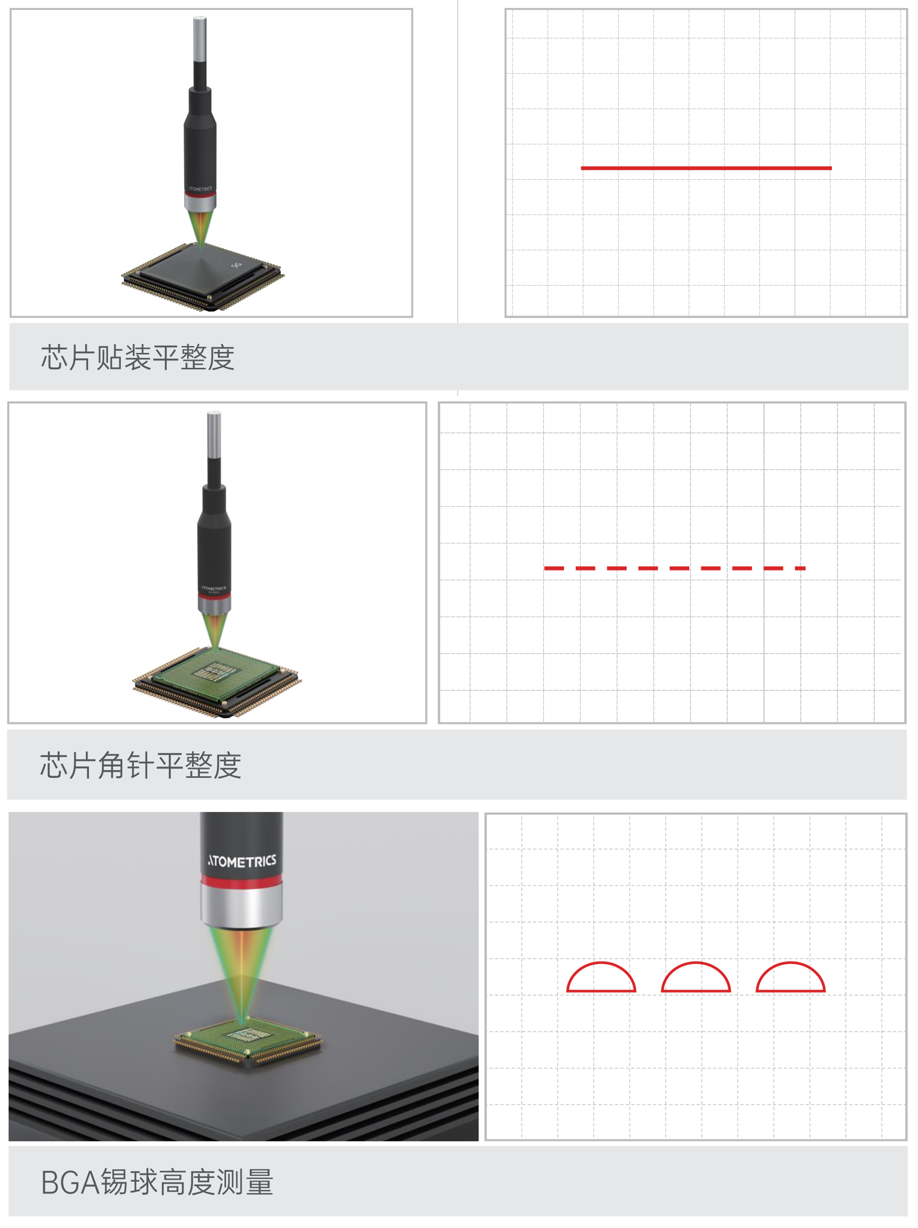 - 光谱共焦位移传感器AP系列:在线测量芯片贴装平整度、角针平整度以及BGA锡球高度,确保封装过程中芯片与基板的精准贴合,避免导致后期失效。