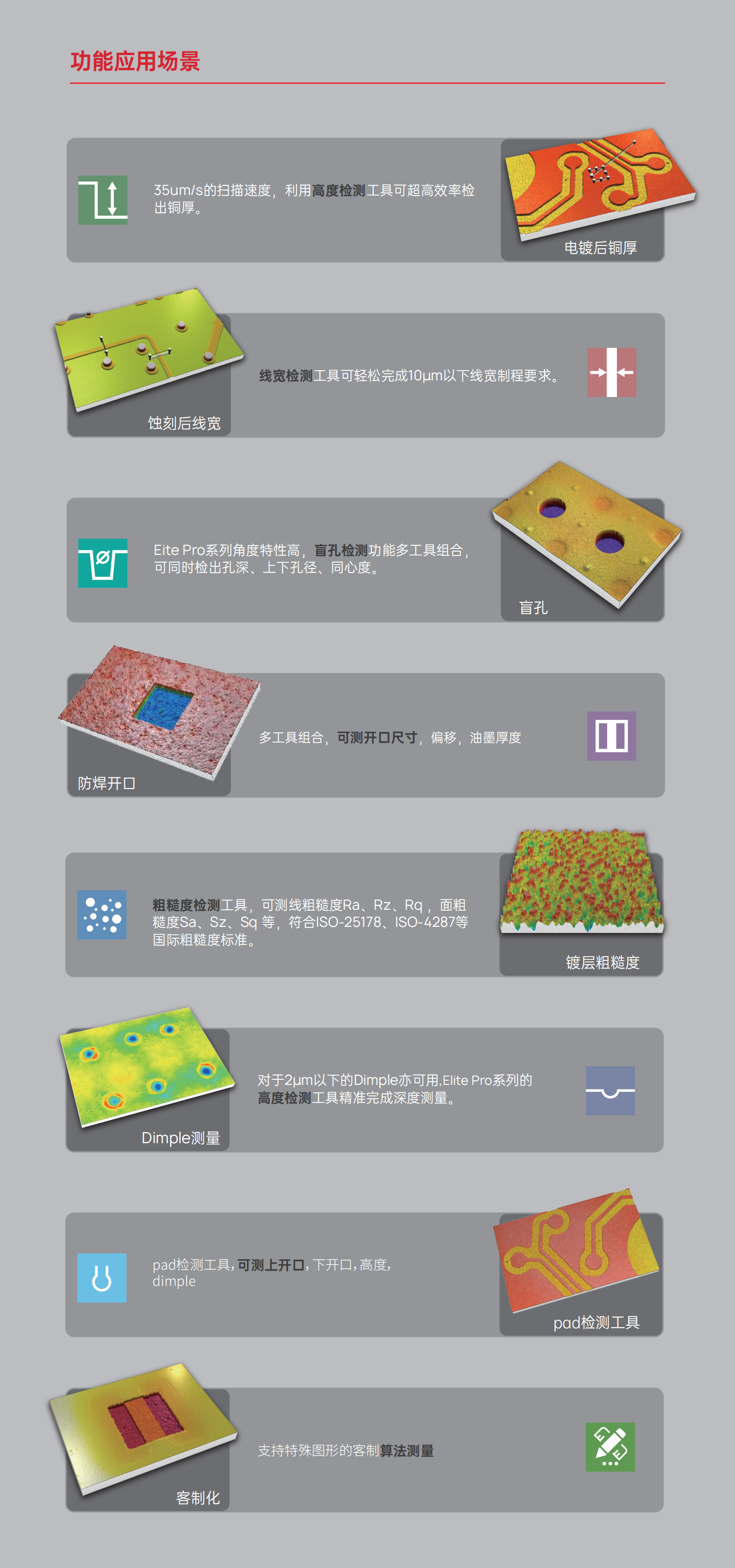 - 封装基板3D自动量测设备Elite Pro系列:一站式全方位自动检测封装基板的镀层粗糙度、电镀后铜厚、线宽线距、盲孔、Pad、Dimple等关键参数,确保芯片封装品质。