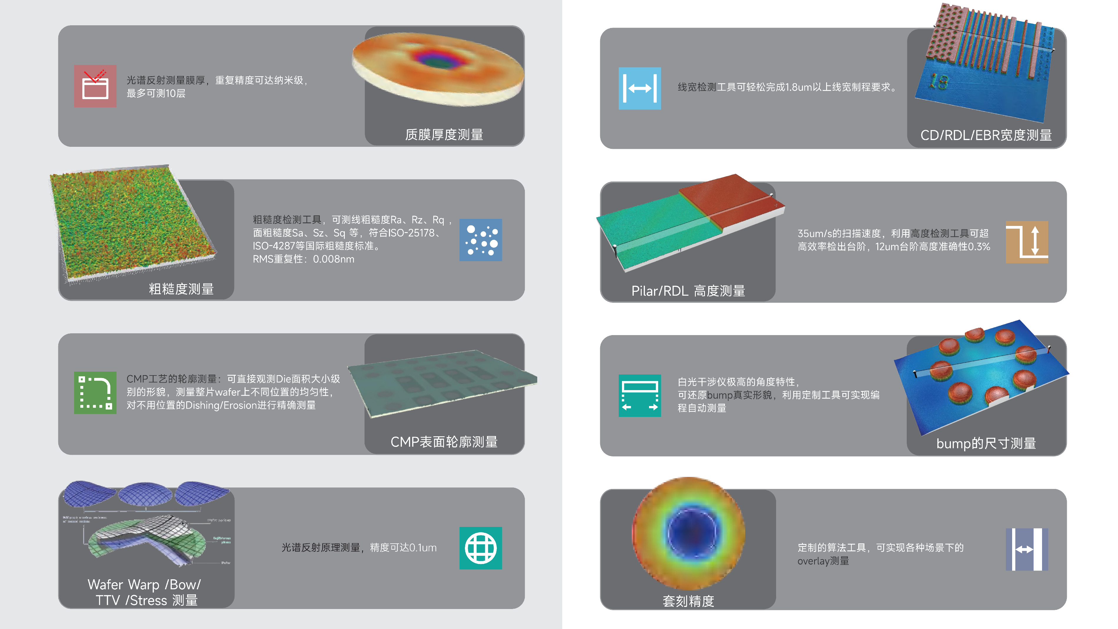 - 晶圆三维量测设备WPM系列:全方位覆盖晶圆Bump、RDL、CD、EBR、PI/PR膜、光刻胶、化合物薄膜、TSV、RST等多维度参数,为晶圆提供全维度测量方案。
