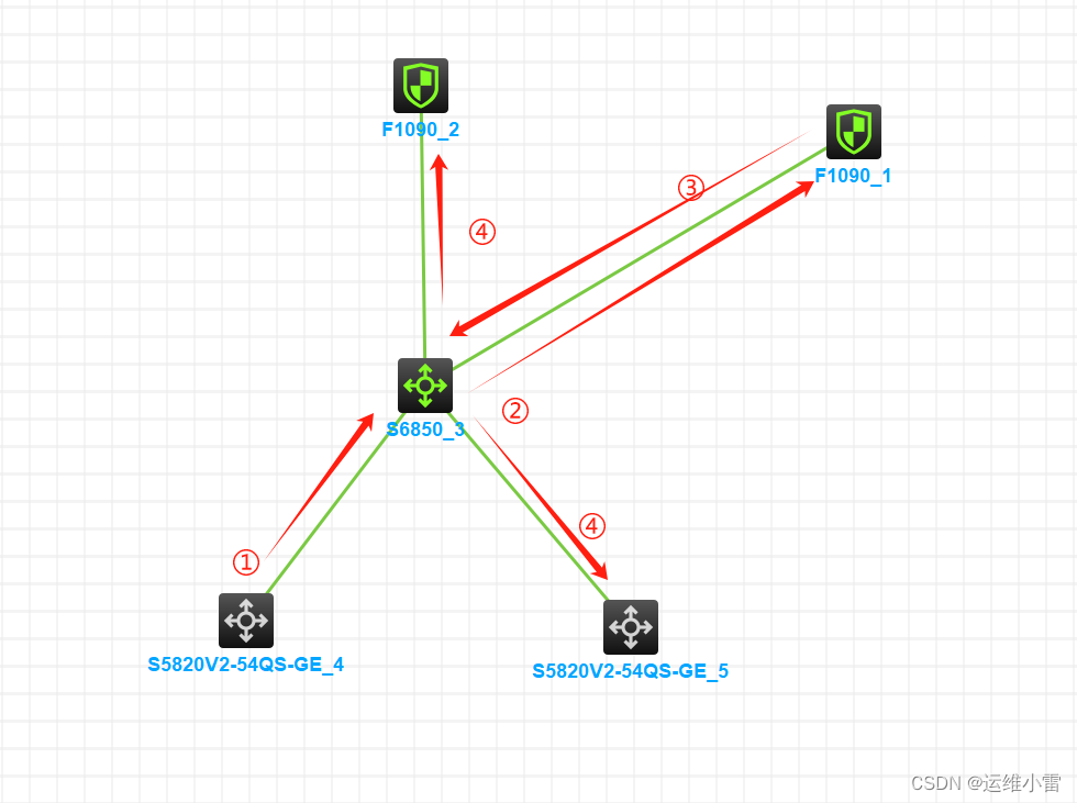需求:核心创建VRF用于隔离网关,使网关之间无法互相通信。内网防火墙与核心互联接口配置子接口,vlan以及地址与核心的VRF相对应。通过设备管理地址,核心与内网防火墙建立OSPF邻居。核心VRF配置默认路由指向隔离防火墙子接口,隔离防火墙配置指向业务网段的路由,下一跳为核心的VRF互联地址。隔离防火墙引入静态路由,核心学习到VRF中的业务网段。实现流量经过隔离防火墙后返回核心,在隔离防火墙通过策略管控内网流量走向。