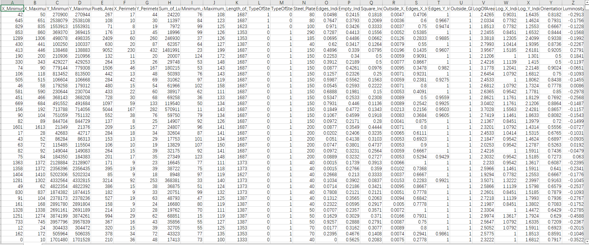 UCI数据库是加州大学欧文分校(University of CaliforniaIrvine)提出的用于机器学习的数据库,这个数据库共有550多个数据集,其数目还在不断增加,UCI数据集是一个常用的标准测试数据集。UCI带钢缺陷数据集包含了7种带钢缺陷类型。这个数据集不是图像数据,而是带钢缺陷的28种特征数据,可用于机器学习项目。钢板缺陷的7种类型为:装饰、Z_划痕、K_划痕、污渍、肮脏、颠簸、其他故障。
