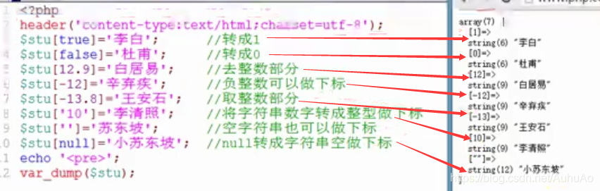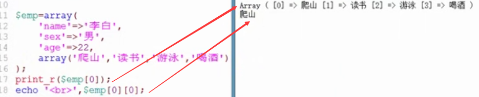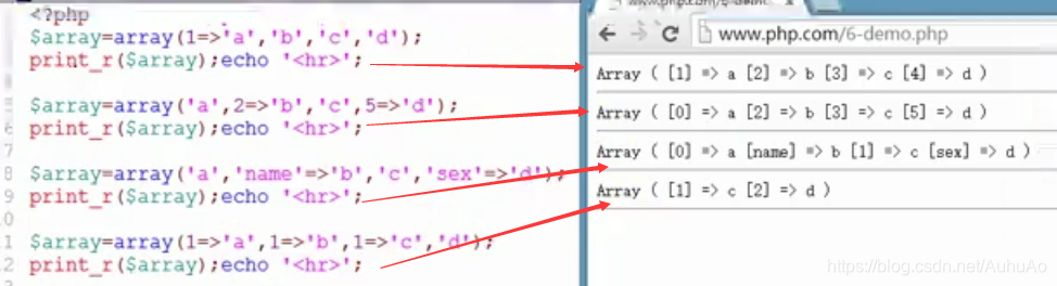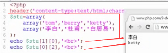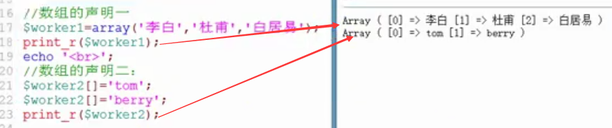 注:不能按照键的数据类型来判断是否是索引还是关联数组,必须看下标和值关联关系,如:$stu=array(1=>'tom',2=>'berry') 属于关联数组,因为下标不是表示值的位置。