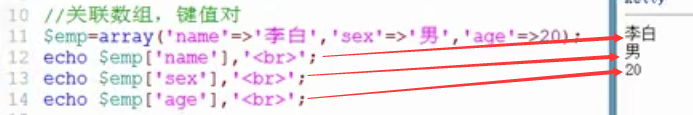 b、关联数组:通过字符串作下标,键和值存在某种关联。
