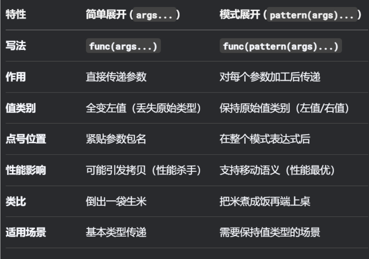 简单展开和模式展开的区别在于,简单展开仅将参数包中的元素依次展开,而模式展开则是按照特定的匹配规则将类型与值一一对应。例如在模式展开中,每个类型都会对应一个特定的值,而简单展开只是将参数包中的内容线性展开,不进行复杂的匹配处理。通过这两张图的对比,我们可以清楚地看到模式展开的优势在于能够精准地匹配每个类型和对应的值,从而更高效地处理参数传递的问题。