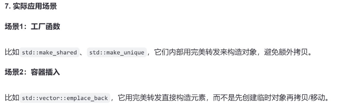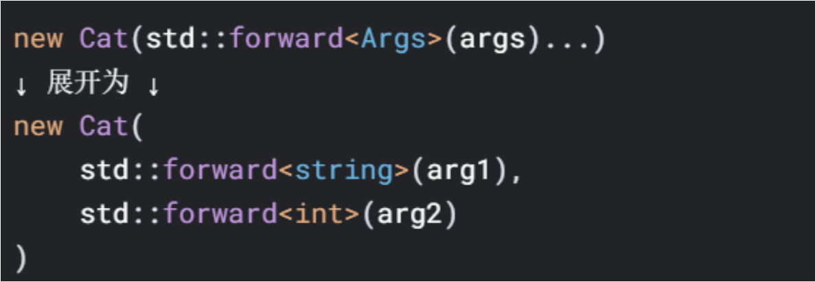 好了,有了这张图我觉得就不需要我过多阐述了,我们继续看这个代码,我们看第二行开头的unique_ptr<T>,为什么是这个类型?因为我们最终make_unique的时候,返回的就是一个unique_ptr<T>,接下来就是make_unique了,这个没什么可说的,就是函数名称,括号里面的就是函数参数包,也就是值,保证了我们输入的时候是值,让编译器自动推断它的类型,最后return的是一个unique_ptr<T>类型。new T(.......)表达的是这是一个T类型的值,但是里面的内容我们要仔细讲讲。完美转发(forward)是什么,我们在传输的过程中,通常会遇见左值和右值,但是编译器很笨,可能转发的时候会将右值改为左值,完全违背了我们的意识,但是有了forward就不一样了,它可以完美的分辨什么是左值什么是右值,并且返回,这就完美的解决了我们所要面对的问题。还有一个问题,为什么后面加着...呢?这就是模式展开,目的是为了将每个类型都对应每个值。