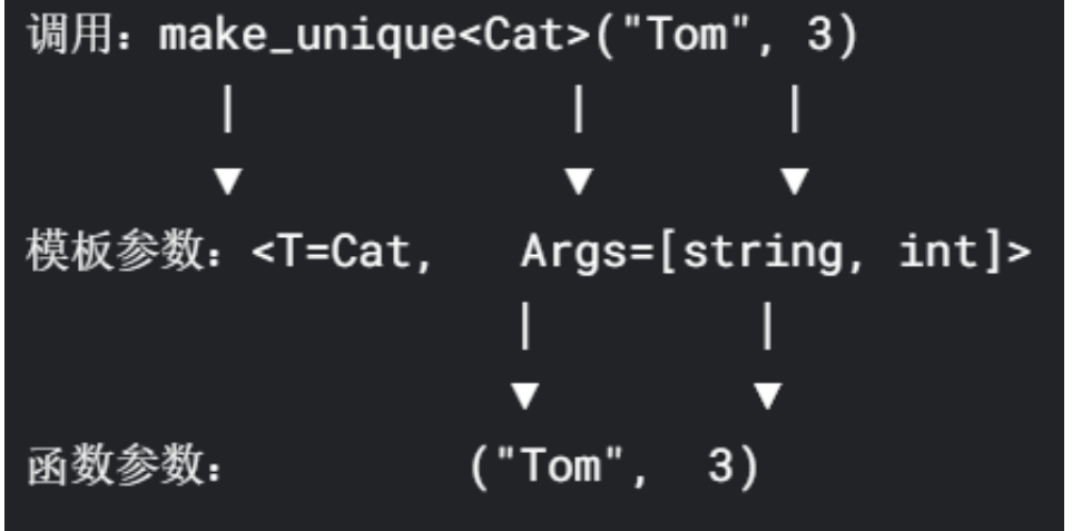 光看这个的话,可能你们会看晕头转向,但是经过我在2025.8.15 的凌晨1点多的不懈努力,终于是把这个搞懂了,我们一步一步来看这个代码,首先是template部分,你首先可能会发现,为什么会有两个模版参数?一个T一个Args,首先,这两个模版参数并不是一样的,你会发现后面的那三个点:...,这个代表这是一个类型包,也就是int ,double,long long这样的类型包,被集合成一个Args了,那么你可能又会问:Args&&...又代表什么?这是表达的是函数参数包,表达的是值啊什么的,比如42,3.14,2e9各种各样的值。到这里,你可能会想,&&不是右值引用吗?为什么要右值引用,万一来个左值不就炸啦?其实这里表达的是万能引用,模版参数加个&&就是万能引用了。好的,说远了,我们继续讲我们的问题:为什么有两个模版参数?其实,这里必须要两个(后面的是类型参数包),保证工厂函数的正确性,比如,有一个结构体dog里面有两个值,一个是string name,一个是 int age,那么当我们想要一个dog类型的智能指针的时候,那么必须要传入name和age,但是你怎么传呢?你需要这样创建(这里默认用unique_ptr):make_unique<dog>(“bai”,10);而dog就是模版参数T,而小括号里面的内容就是Args函数参数包里面的类型(string,int),对应的构造函数将他们赋值成为了(“bai”,10)。这就是类型参数包和函数参数包的作用,接下来附一张图: