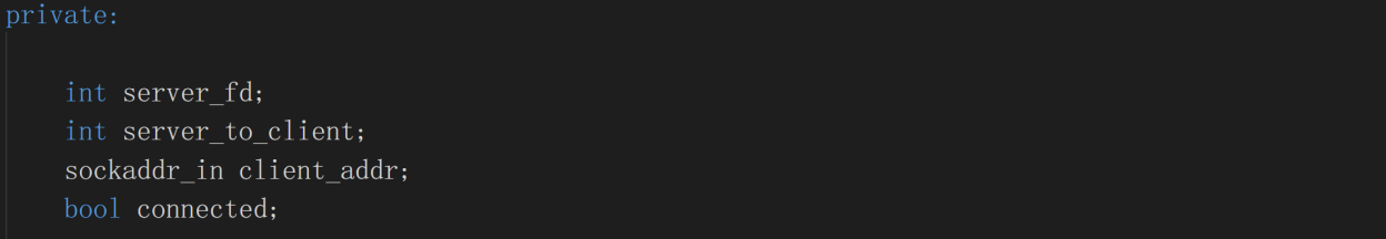 第三步,创建类,类名暂时起为,TCPserver,然后我们就要想了,public里面肯定是函数,private里面填什么?这里有个技巧,如果一个变量(或函数)在public中的函数中使用次数达到二次以上,那么就将这个变量(或函数)加入到private中,那么就清晰明了了,我们按照server的通信流程来说的话,那么肯定要socket这个函数啊,这个函数返回的值我们常用的很,不管是bind还是listen都需要这个值,通过这样的判断,我们可以很轻易的得知什么变量(或函数)必须加入到private中,这里额外说一下,我们必须要一个bool类型的connected,你想,这是个类,里面的函数只要是public都可以被调用,那么也就是说,我可以不按顺序调用函数,万一我的服务器还没搭建好,我直接调用send函数,是不是就不行啦,所以connected是必须的,其他的变量(或函数)也通过这样的方式判断下来,就可以知道private中到底有什么了。