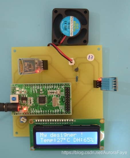 本设计由STM32单片机、风扇控制电路、温湿度传感器电路、1602液晶显示电路+蓝牙模块电路和电源电路组成。通过温湿度传感器检测温湿度,并在液晶上和APP上实时显示。当湿度超过75度,APP发出报警信息,通过APP发送指令“O”,风扇启动。通过APP发送指令“C”,风扇关闭。