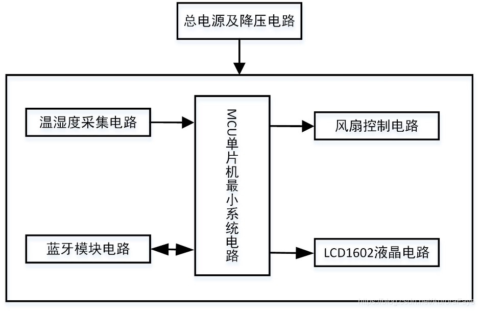 本设计由STM32单片机+风扇控制电路+温湿度传感器电路+1602液晶显示电路+蓝牙模块电路+电源电路组成。