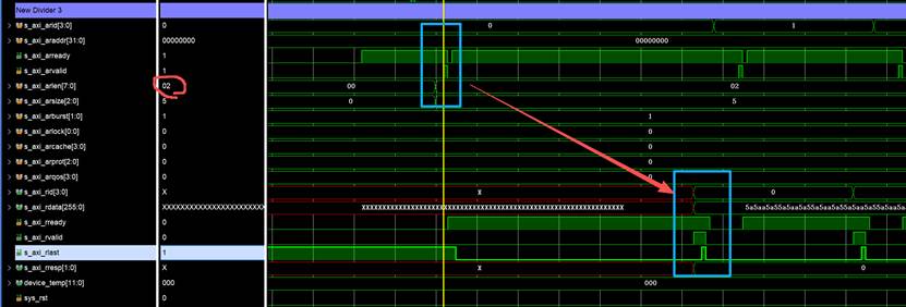 S_AXI_AR*,S_AXI_R*。重点观察VALID/READY握手以及RLAST信号。 -