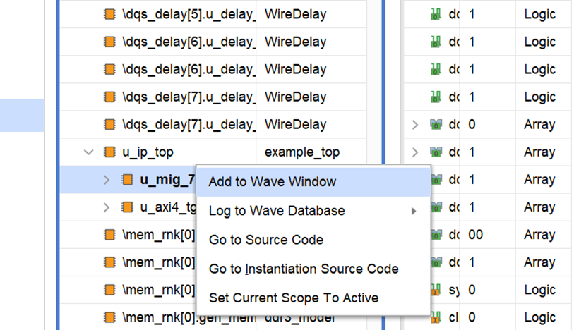 我们从左侧,选择我们要看的IP核,右键 Add to Wave Window,就可以打开mig的时序