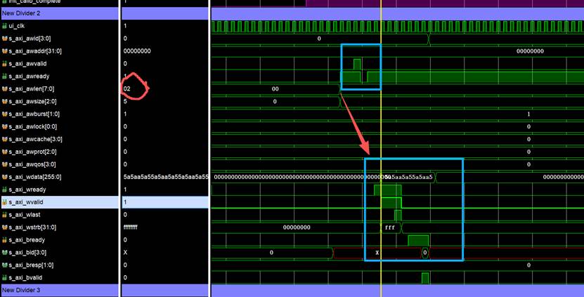 展开之后可以看到,第一笔是在0x0000_0000地址上写了3笔0x5a5aa5a5………的数据,为什么这里写的是3笔?因为这是burst传输,awlen配置为2,所以传输数据为awlen+1个