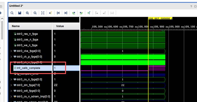 大约在108us的时候,init_calib_complete拉起,既DDR3初始化完成。