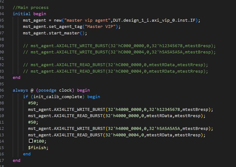 9 添加测试激励,注意必须是DDR3初始化完成之后再进行数据读写,DDR3初始化完成的标志为init_calib_complete拉高。
