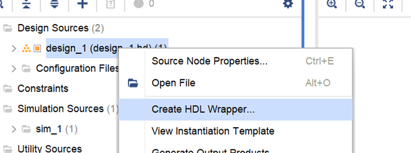 编译完成之后,右击选择Create HDL Wrapper 生成之后用于例化的顶层文件。