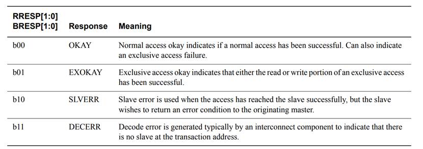 写响应:00 OKAY, 01 EXOKAY, 10 SLVERR, 11 DECERR。 |
