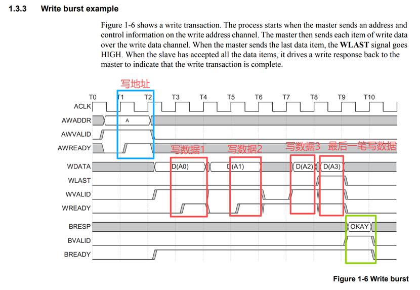 当AWVALID和AWREAY同时为高的时候,写地址AWADDR有效,此外对应的AWSIZE、AWLEN等信号均是此时有效,传输4笔数据,对应的AWLEN应该是3,图中虽然没有显示,但是大家需要知道有这个信号的存在;