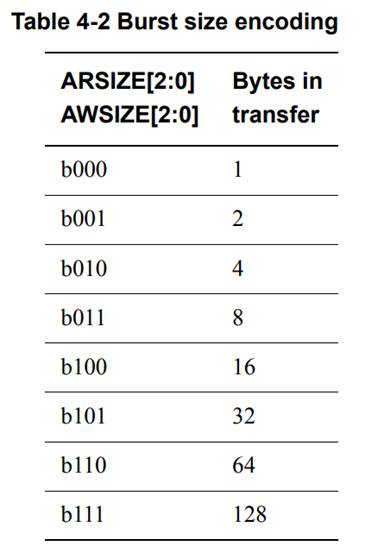 每次传输的字节数(如 3'b010 表示 2^AWSIZE即4字节)。 |