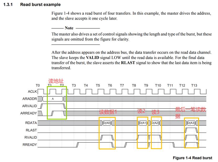 当ARVALID和ARREAY同时为高的时候,读地址ARADDR有效,此外对应的ARSIZE、ARLEN等信号均是此时有效,读4笔数据,对应的ARLEN应该是3,图中虽然没有显示,但是大家需要知道有这个信号的存在;