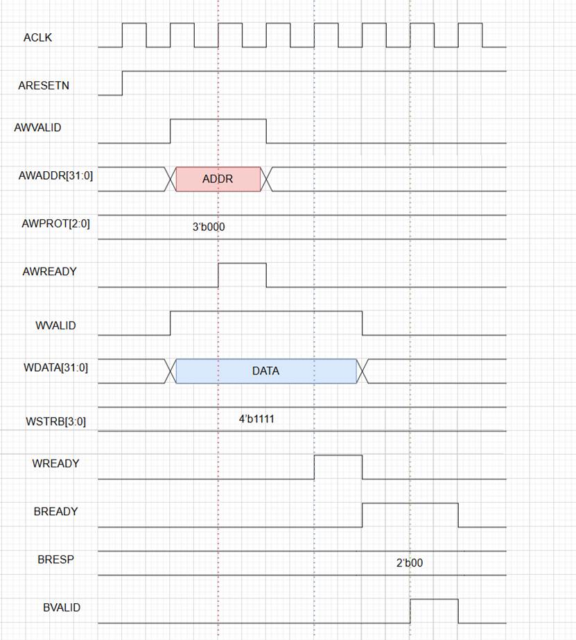 注意:虽然说AWREADY信号可能会提前拉高,但是主机写入地址后必须主动拉高AWVALID信号,AWVALID不能等待AWREADY拉高后才拉高