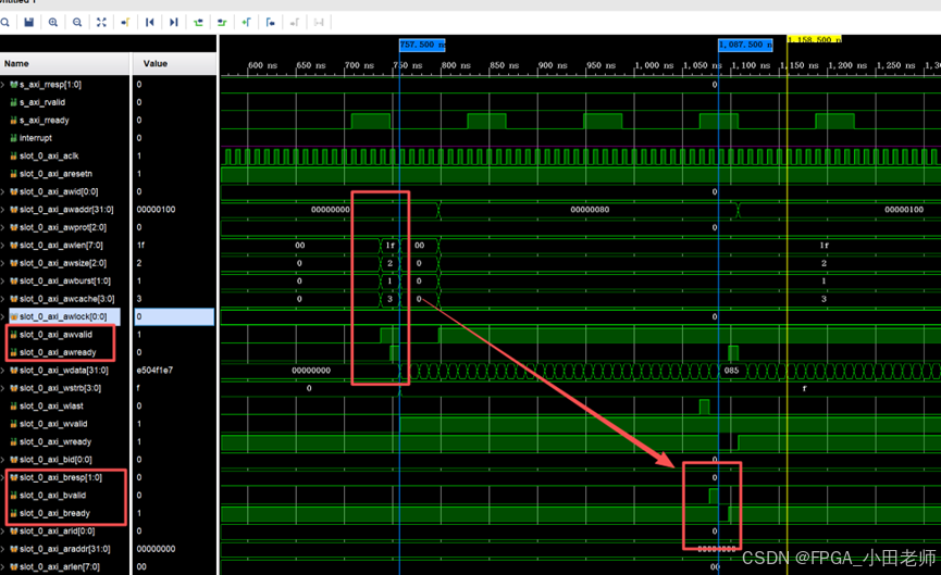 如下图所示,我们以写事务为例,我们每完成一次写事务,即每收到一次写Resp信号,我们认为完成了一次写事务,写事务计数器(0x0210寄存器)就会+1;