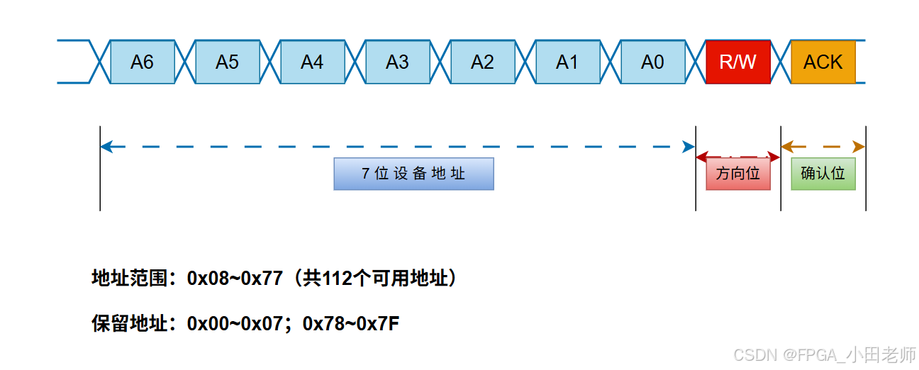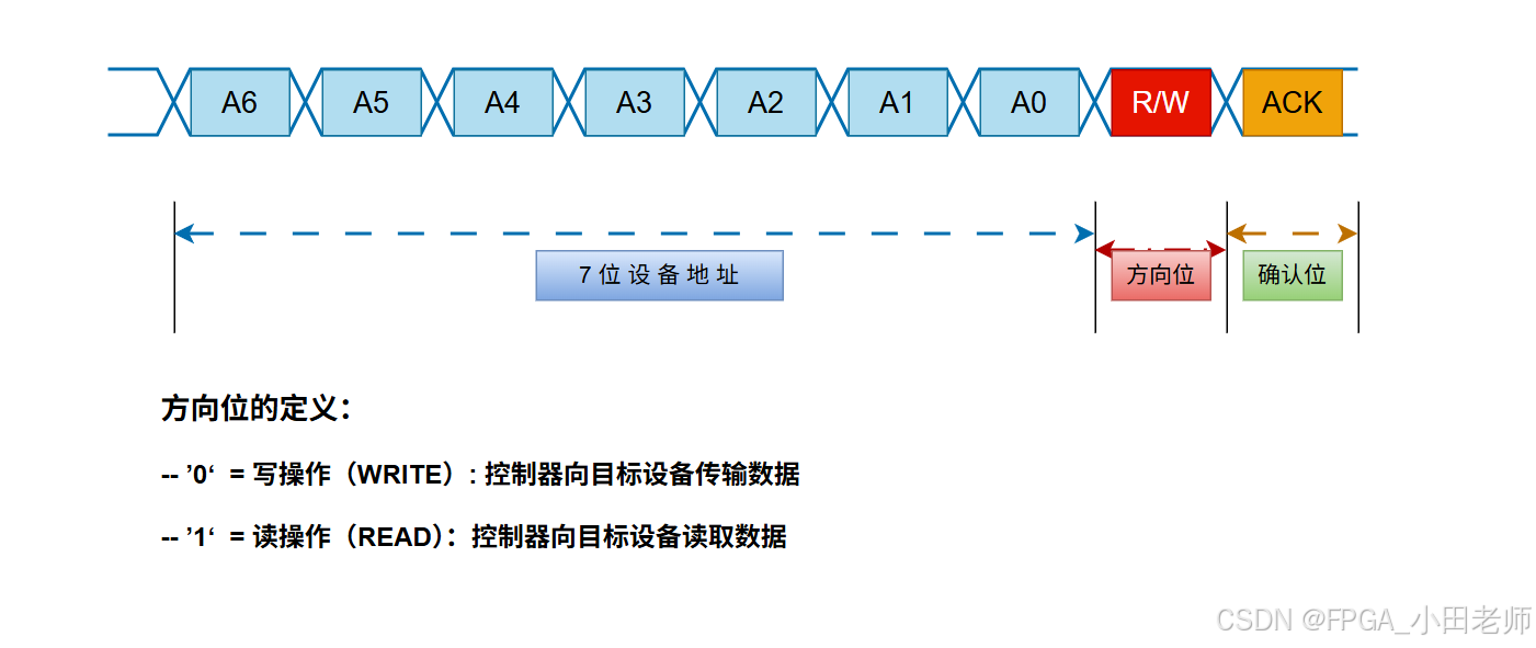 起始条件(S) → 目标地址(7位) → 方向位(R/W) → 确认位(ACK) → 数据字节 → 确认位 → ... → 停止条件(P)