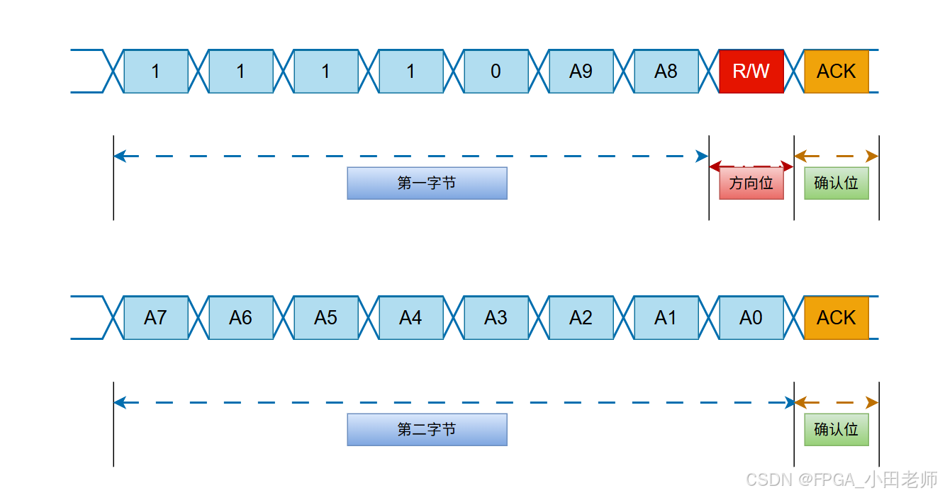 广播呼叫地址(0x00) + ACK + 地址低8位 + ACK + 地址高2位 + ACK