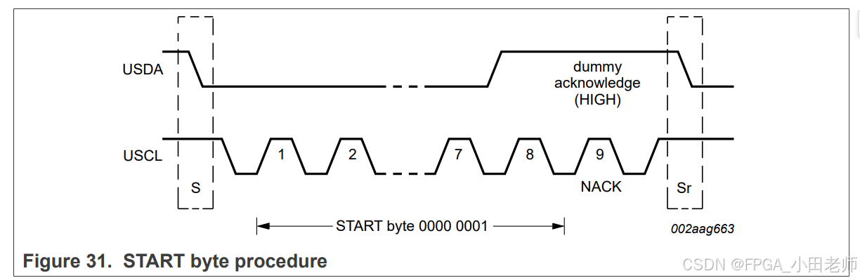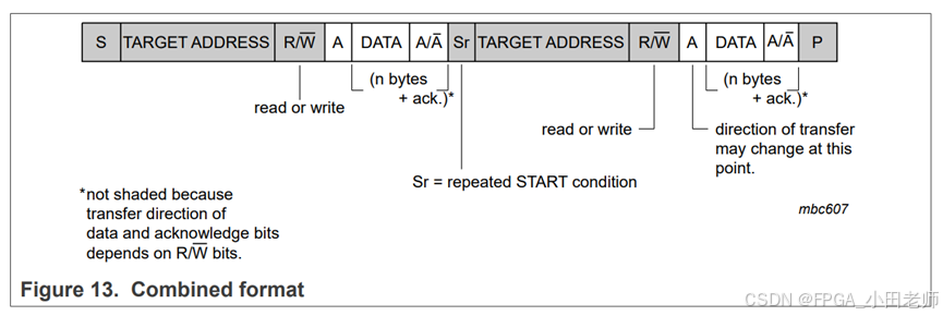 如果产生的是重复起始(Sr)条件而非停止条件,则总线保持忙状态。在这方面,起始(S)和重复起始(Sr)条件在功能上是相同的。