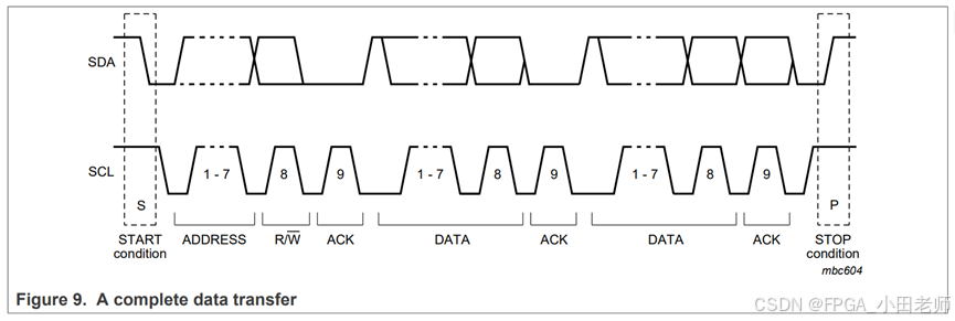I2C总线的数据传输遵循严格的格式规范,所有通信都由起始条件(S)开始,由停止条件(P)结束。数据传输的基本流程如下:
