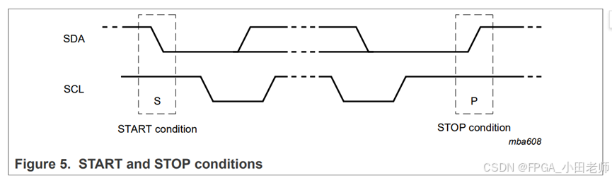 所有传输都以起始信号(S)开始,并以停止信号(P)结束(见图 5)。当串行时钟线(SCL)为高电平时,串行数据线(SDA)上由高到低的跳变定义为起始条件。当 SCL 为高电平时,SDA 上由低到高的跳变定义为停止条件。