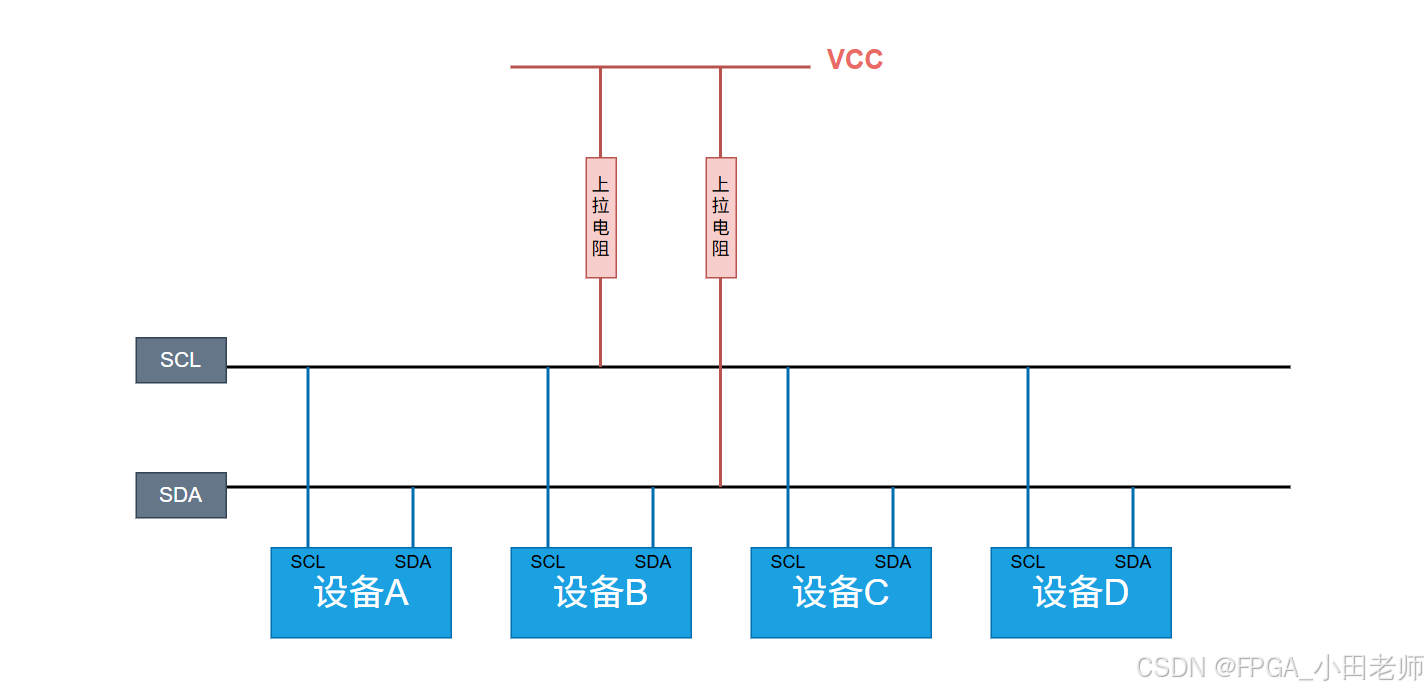 仅需两根信号线:SDA(串行数据线)和SCL(串行时钟线)