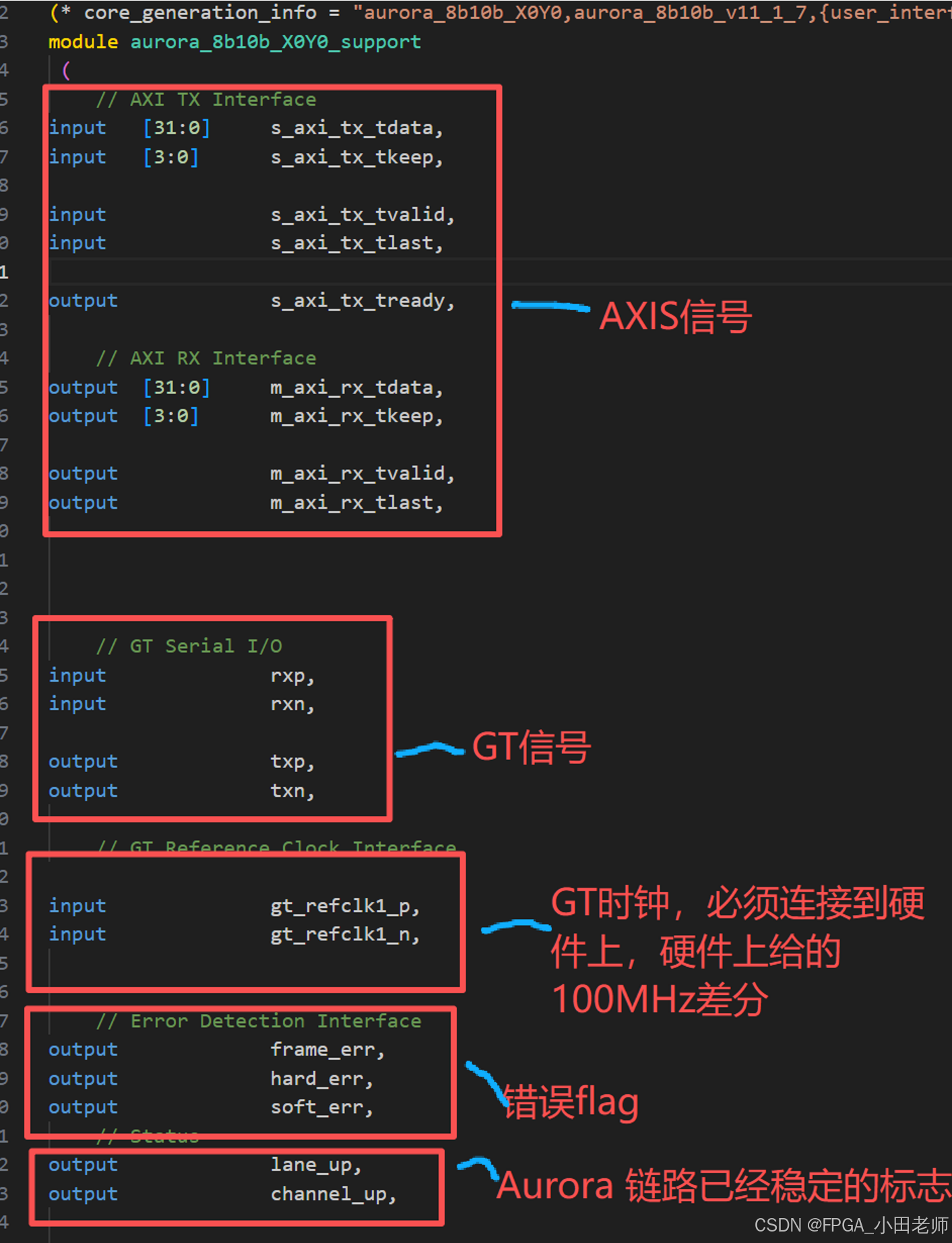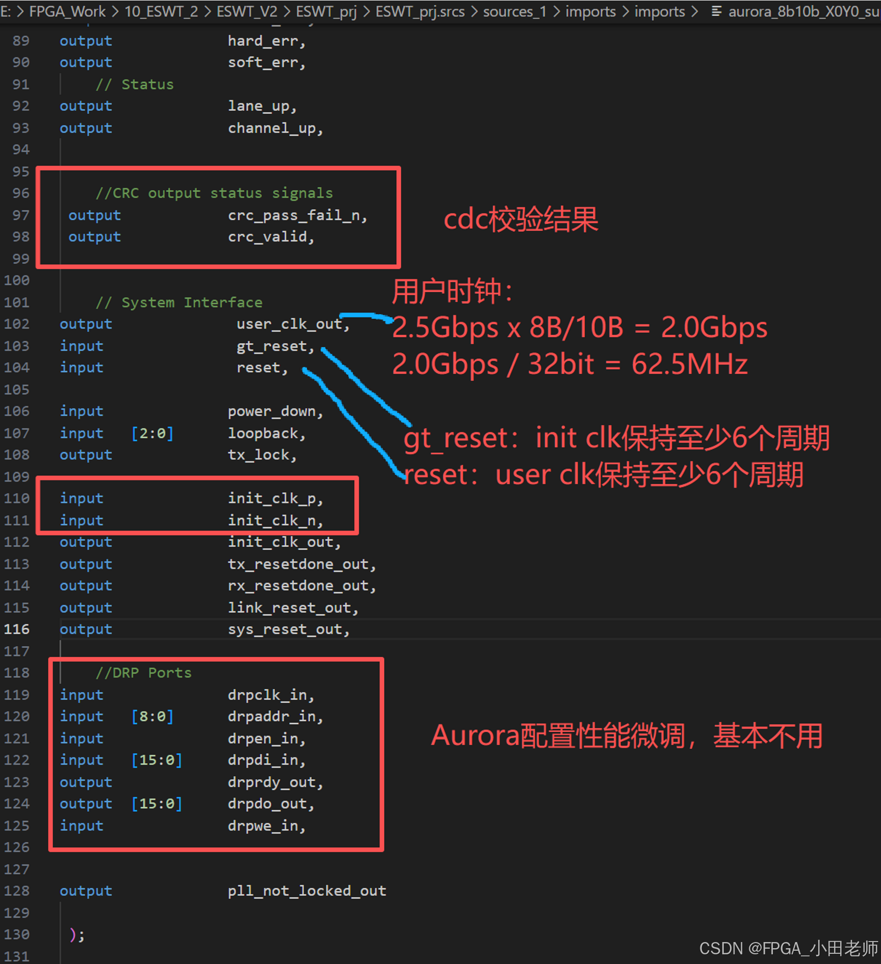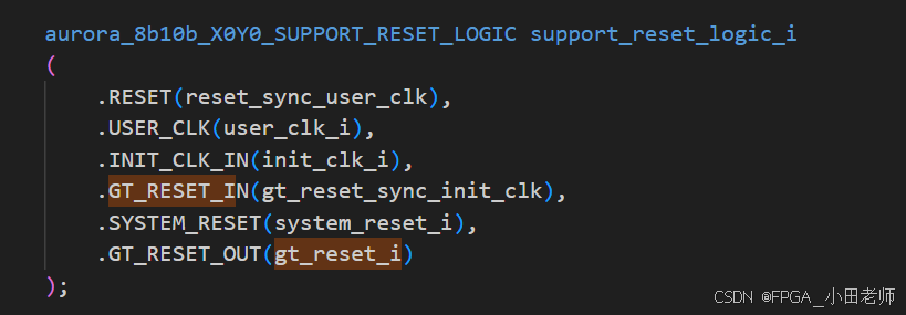 这里我们需要注意:送入support的reset和gt_reset信号经过了这个模块之后的GT_RESET 和 SYS_RESET才是真正给Aurora IP核使用的。