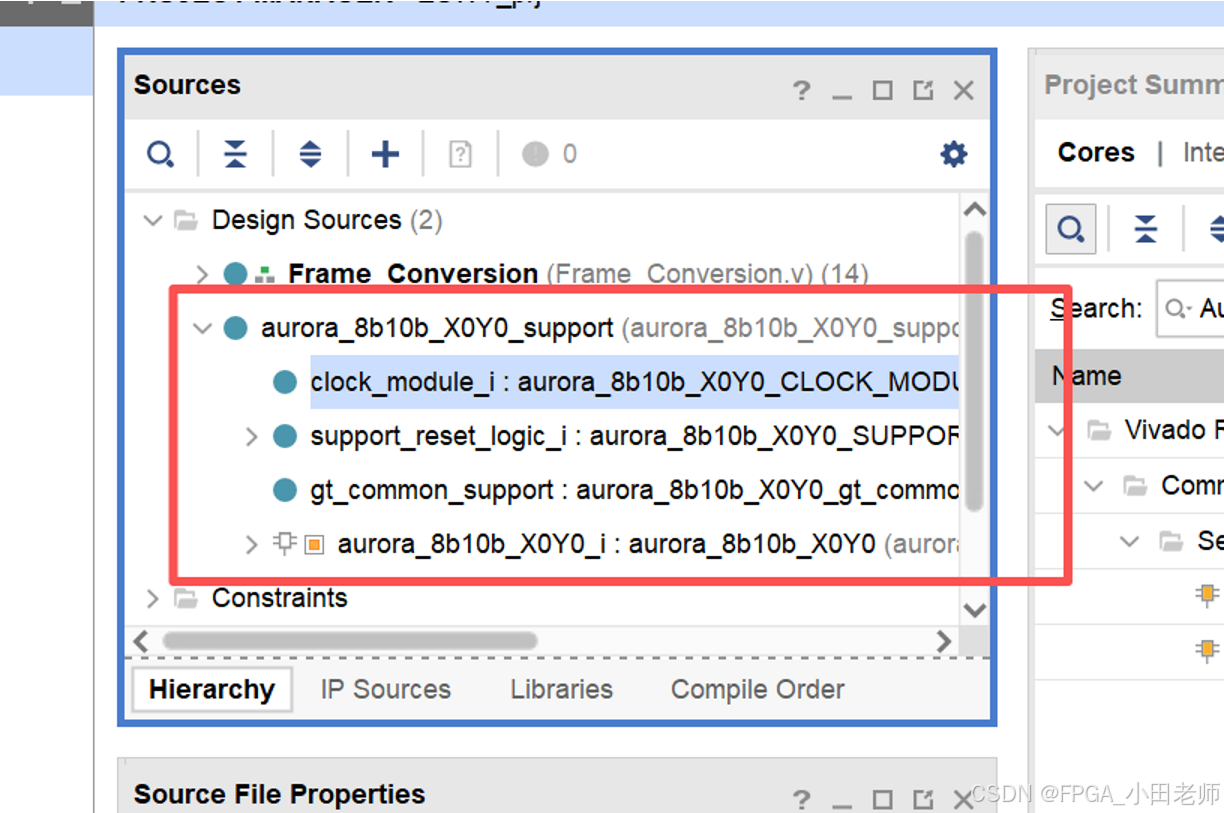 由于我们是要例化4个Aurora IP核 分别对应一个lane 但是共有一个QUAD的时钟,故,我们需要在程序内部,将Aurora IP核部分例化为4个。