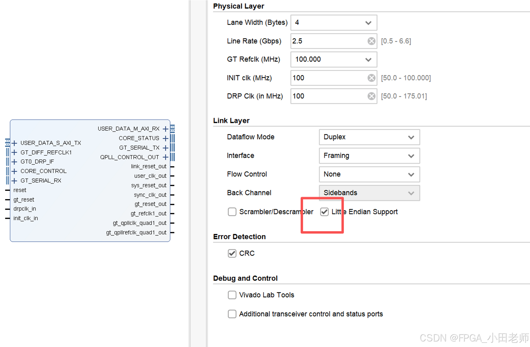 根据系统架构要求,必须选择小端模式(Little Endian)以确保与AXI4-Stream兼容IP核的无缝连接。
