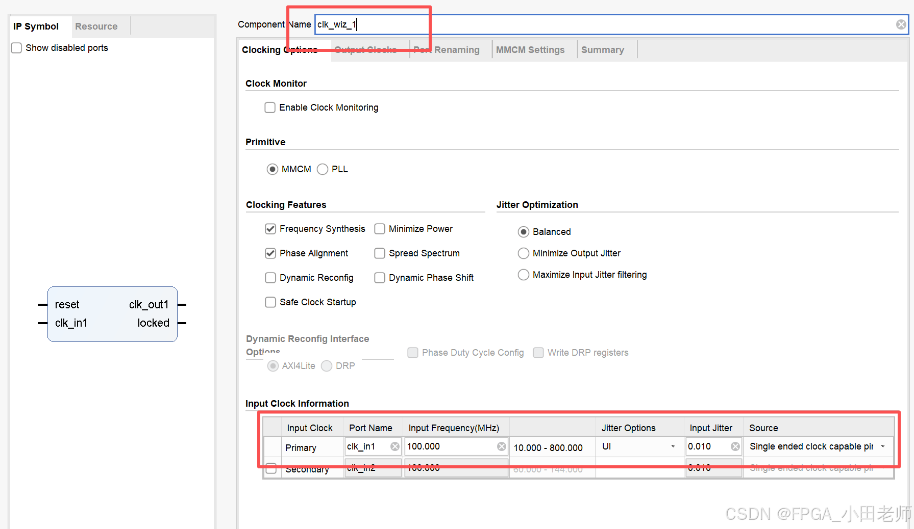 Clocking Wizard是Xilinx Vivado设计套件中的一个IP核,用于自动化和简化FPGA中的时钟管理。它提供了一个图形化界面来配置MMCM(混合模式时钟管理器)和PLL(锁相环),让开发者无需深入理解底层复杂的时钟架构,就能生成稳定、精确的时钟信号。