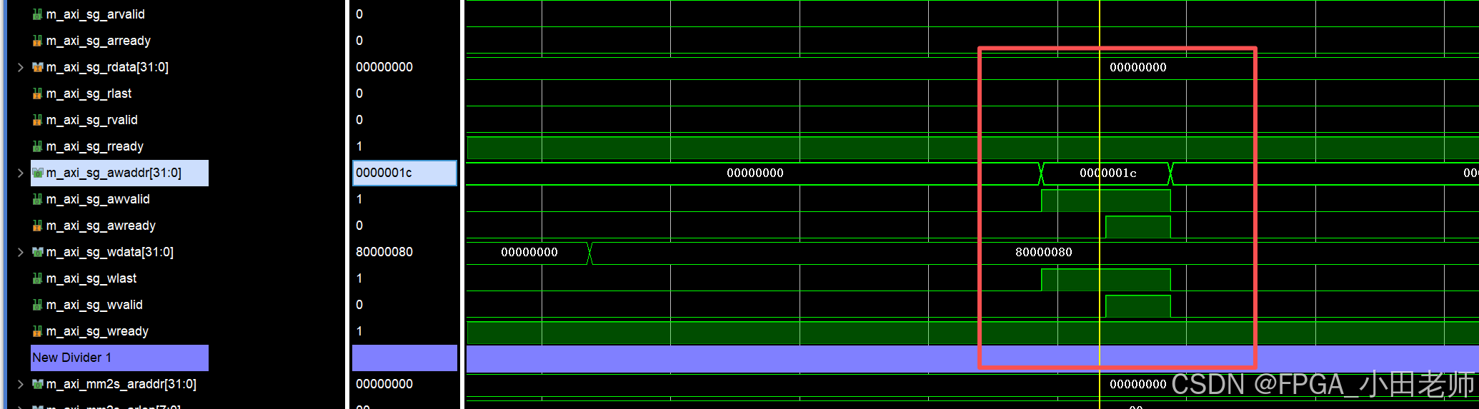 当第二个链表配置信息读取成功之后,AXIS_S2MM接收stream流数据,转为AXI4_S2MM,写数据的基址为0x0000_0080
