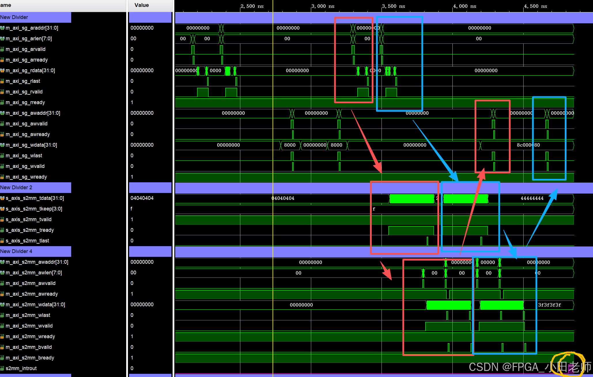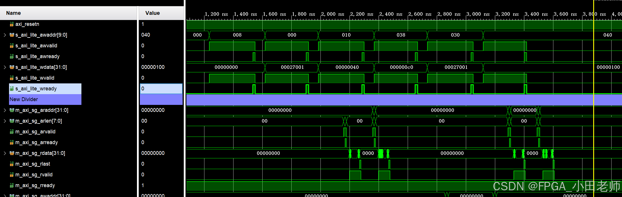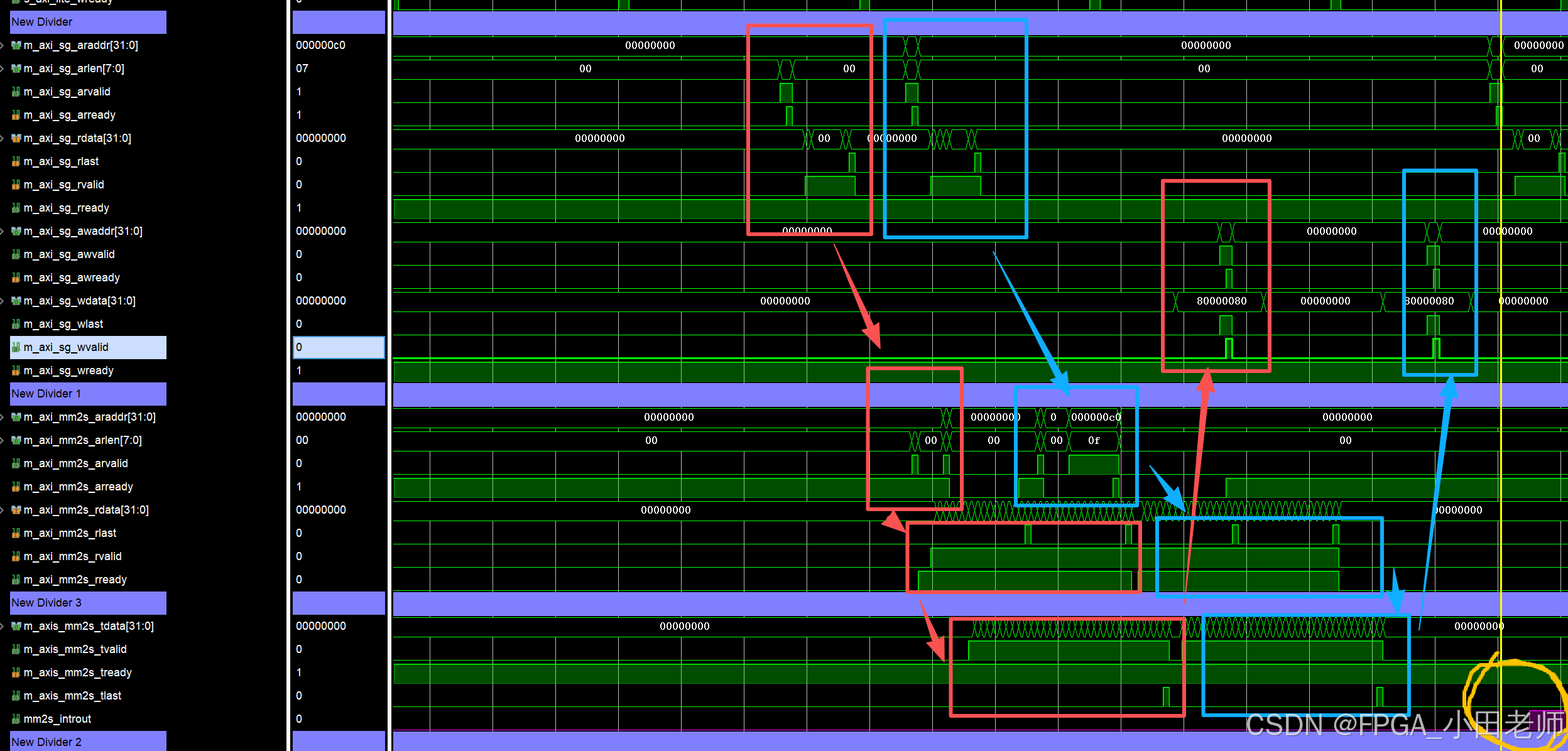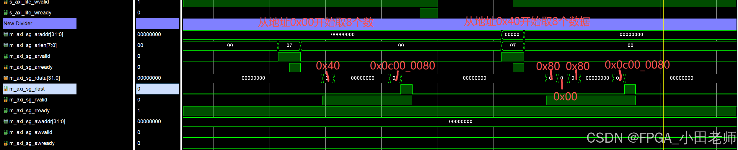 从仿真可以看出,当0x000配置完成之后,AXI4_SG从0x0000_0000的基地址开始取SG的配置信息。