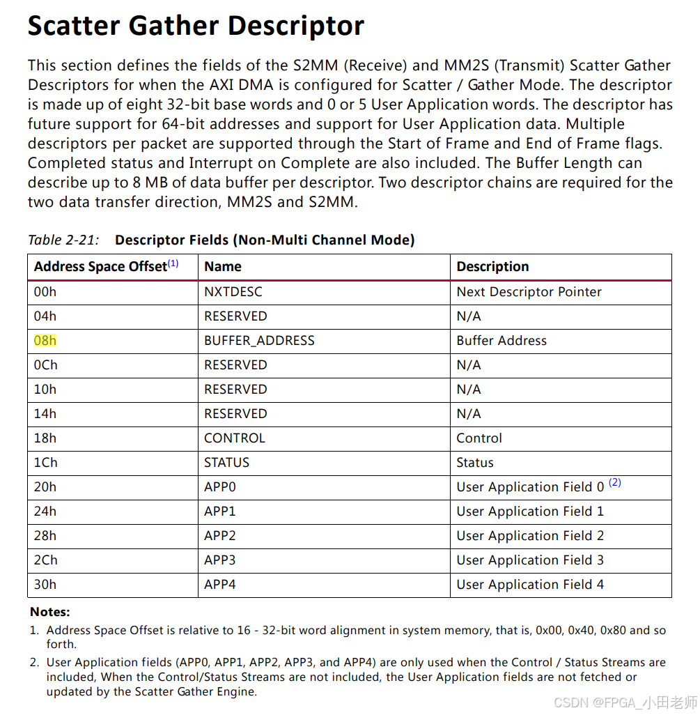 当我们配置完,描述符的首指针 并使能DMA之后,SG通道就从指针对应的地址,取链表信息,链表信息包含了如下配置。